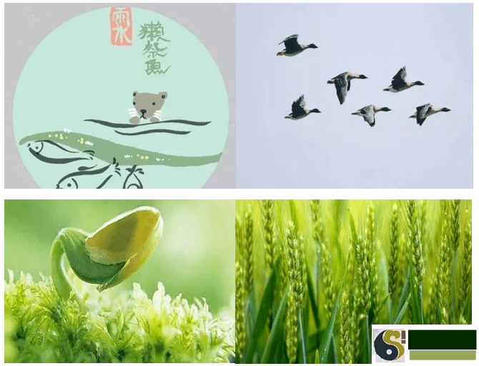 一候獭祭鱼,雨水后鱼塘里的冰解除冻结了,鱼群总算能够 浮起水面吐泡泡了,肚子饿了一个冬季的水獭,见到鱼群出水透气性,乘飞机抓了填饱肚子,水獭们还会继续把捉到的鱼一条一条齐整的摆放在岸上如同在祭拜一样。